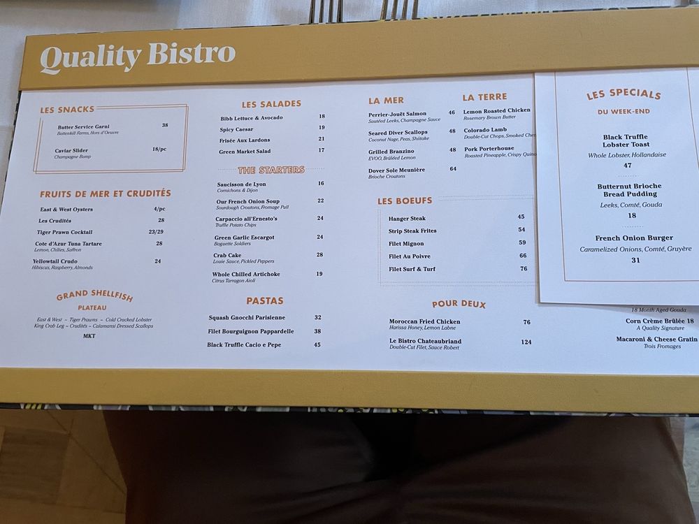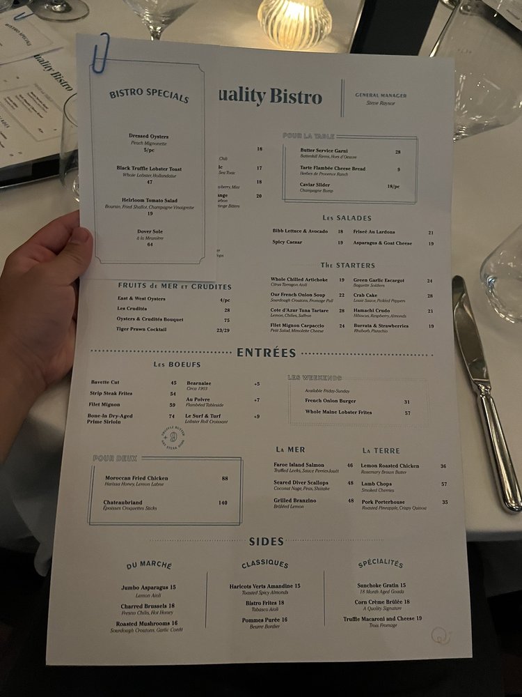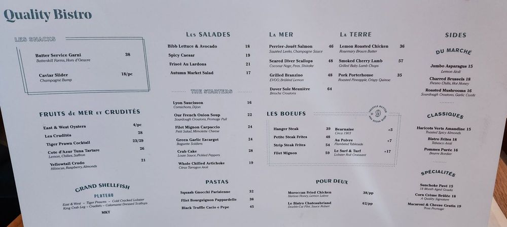 Introducing the menu at Quality Bistro, located in New York City, offers a variety of options for diners. The restaurant provides a range of services from reservations to takeout, with keto and pescatarian choices available. The atmosphere is described as casual, intimate, and classy, with upscale dining and moderate noise levels. The establishment offers outdoor seating, wheelchair accessibility, and accepts various payment methods, including cryptocurrency. Customers have praised the personalized service, recommending dishes and providing a delightful dining experience. Highlights include the red wine selections, impeccable service, and unique dishes like the corn crème brûlée and butter appetizer. Quality Bistro is a perfect spot for special occasions or a memorable dining experience in the heart of the city.